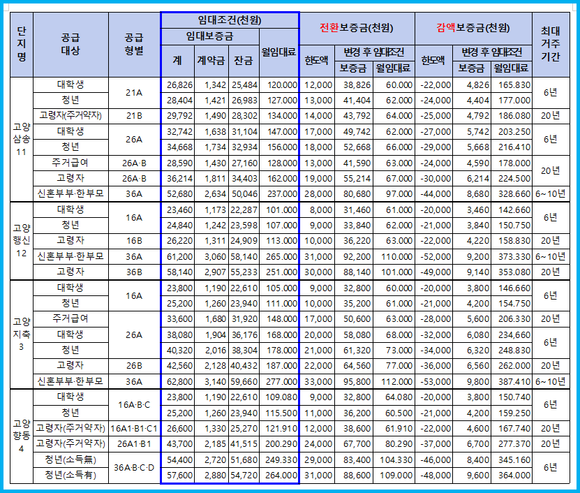 각 단지 및 주택형별 임대보증금과 월 임대료가 위와같습니다.